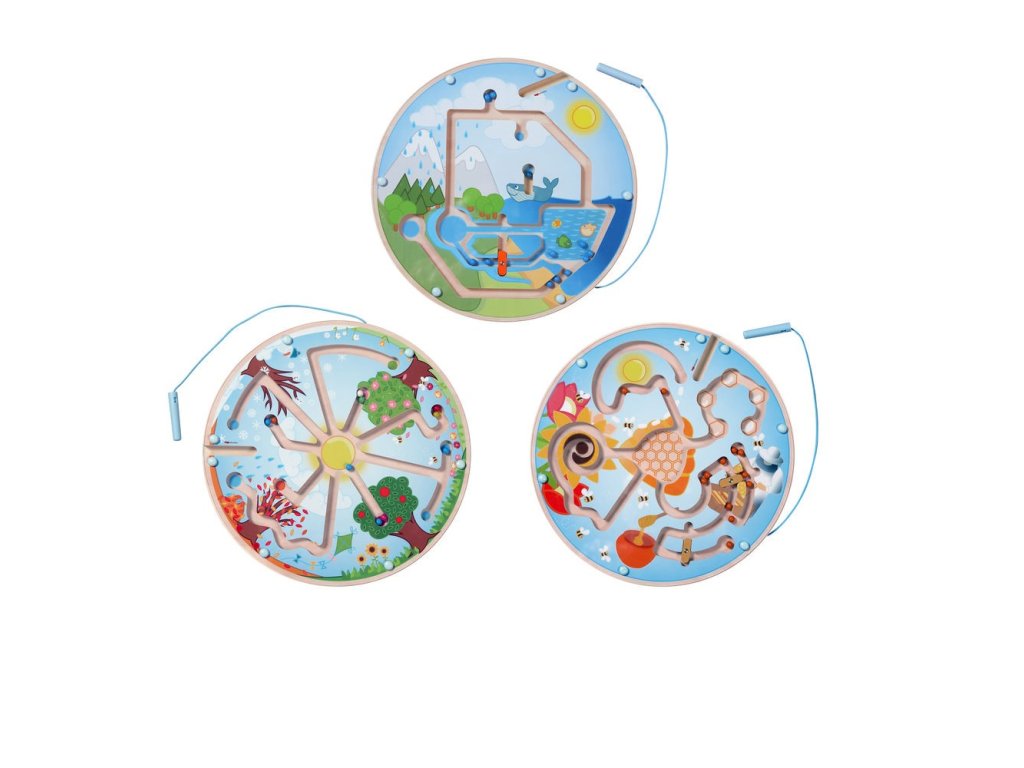 Pomocí magnetického pera, lze malé kuličky protlačit třemi kruhovými labyrinty.